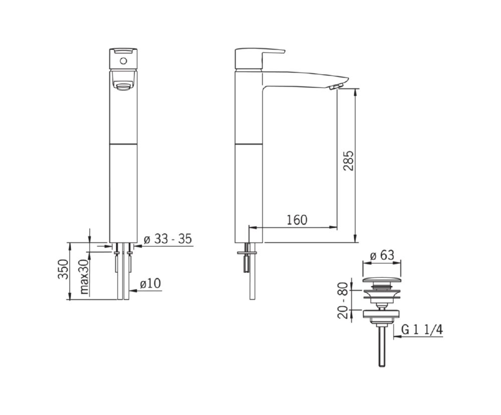 Высокий смеситель с подводкой из медных трубок, с донным клапаном