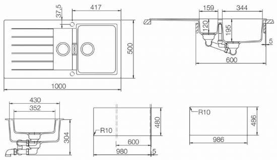 Отводная арматура с переливом и сифоном с возможностью подключения посудомоечной или стиральной машины. Коландер из нержавеющей стали.