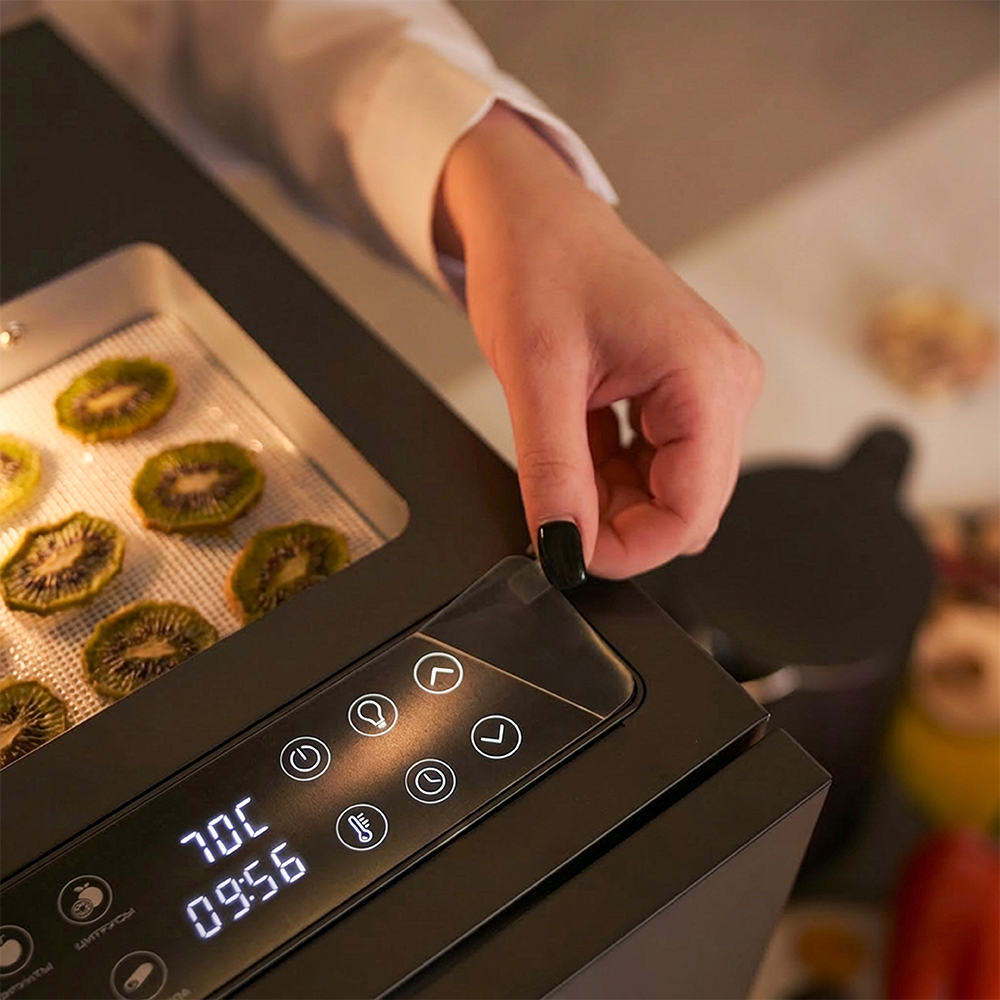 Чёрный корпус из нержавеющей стали, устойчивый к нагреву, влаге и коррозии, выглядит лаконично и современно, легко вписывается в интерьер кухни или мастерской. Внутри установлено 14 поддонов из нержавеющей стали с зазором 25 мм — этого достаточно, чтобы удобно размещать ломтики фруктов, травы или мясные полоски.