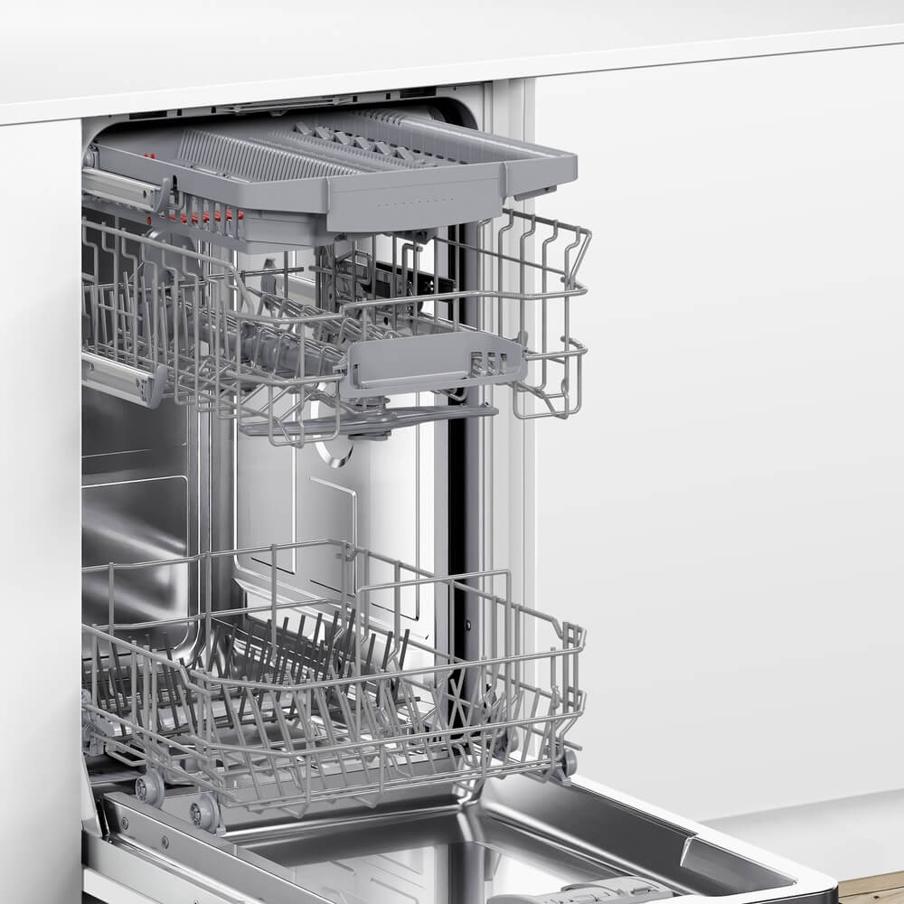 Посудомоечная машина Bosch SPV4EMX10E — узкая модель, которая рассчитана на единовременную обработку до десяти комплектов посуды. Прибор встраивается в нишу размером 81,5-87,5х45х55 см. Регулируемые задние ножки помогут нивелировать неровности пола.