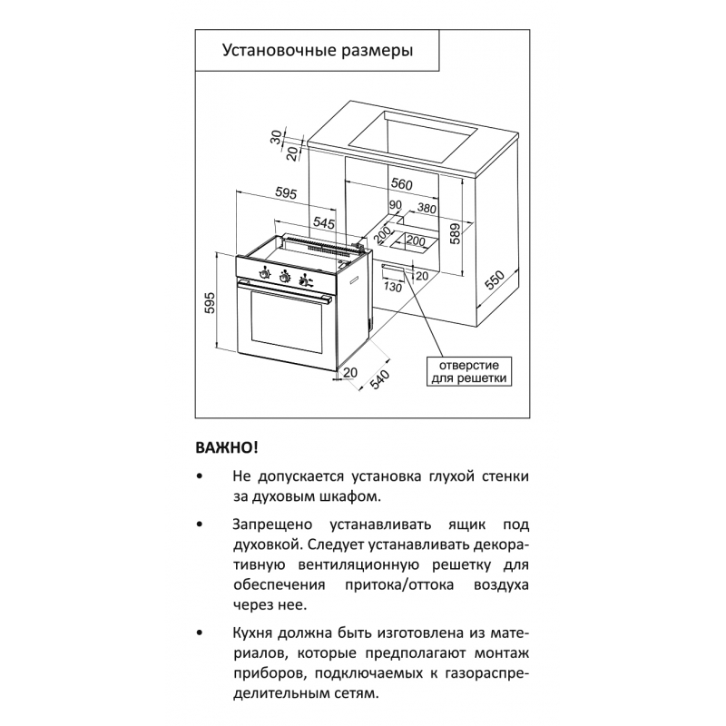 ВАЖНО: Газовый духовой шкаф устанавливается в пенал кухни с заранее предусмотренной системой вентиляции прибора. Необходимые размеры вентиляционных отверстий указаны в инструкции. Запрещено устанавливать ящик под духовкой. Следует устанавливать декоративную вентиляционную решетку для обеспечения притока/оттока воздуха через нее. Не допускается установка глухой стенки за духовым шкафом. Кухня должна быть изготовлена из материалов, которые предполагают монтаж приборов, подключаемых к газораспределительным сетям, а подключение вправе оказывать только специализированная организация, получившая в установленном порядке допуск к выполнению работ.